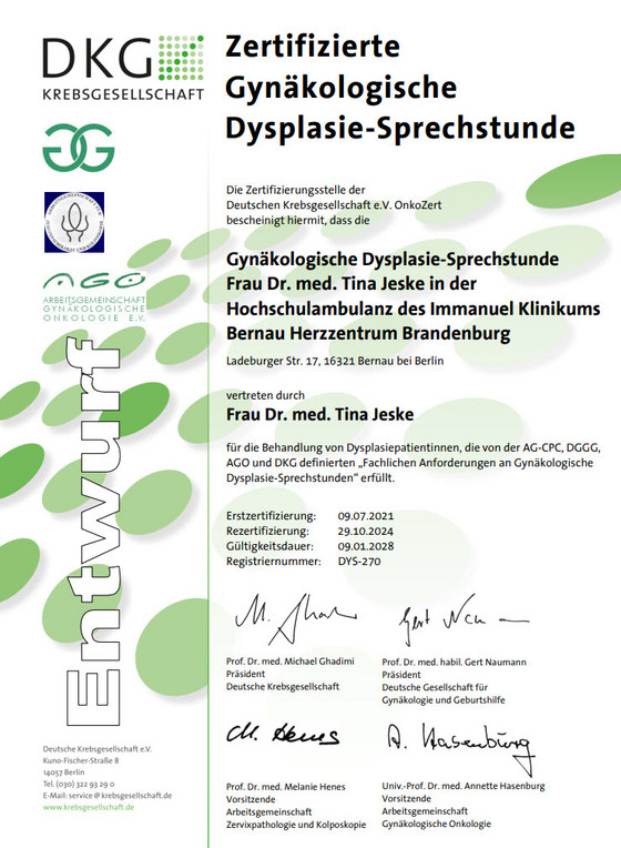 Die Zertifizierungsstelle der Deutschen Krebsgesellschaft e.V. OnkoZert bescheinigt, dass die Gynäkologische Dysplasie-Sprechstunde von Frau Dr. med. Tina Jeske in der Hochschulambulanz des Immanuel Klinikums Bernau Herzzentrum Brandenburg für die Behandlung von Dysplasiepatientinnen, die von der AG-CPC, DGGG, AGO und DKG definierten „Fachlichen Anforderungen an Gynäkologische Dysplasie-Sprechstunden“ erfüllt.